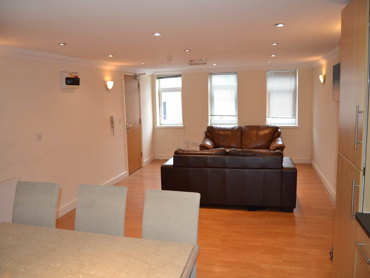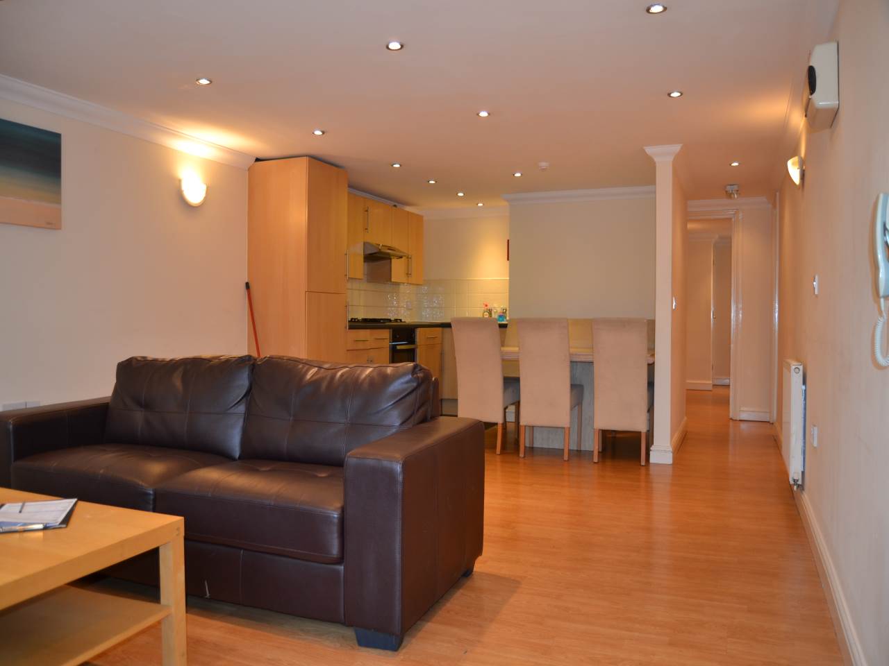 First floor 2 bed flat: refurbished to an excellent standard in modern style with laminate flooring, leather suite fitted kitchen , fully tiled bathroom includes a separate shower cubicle. Intercom entry system. professionals only. Enclosed rentable private parking to rear if required.
