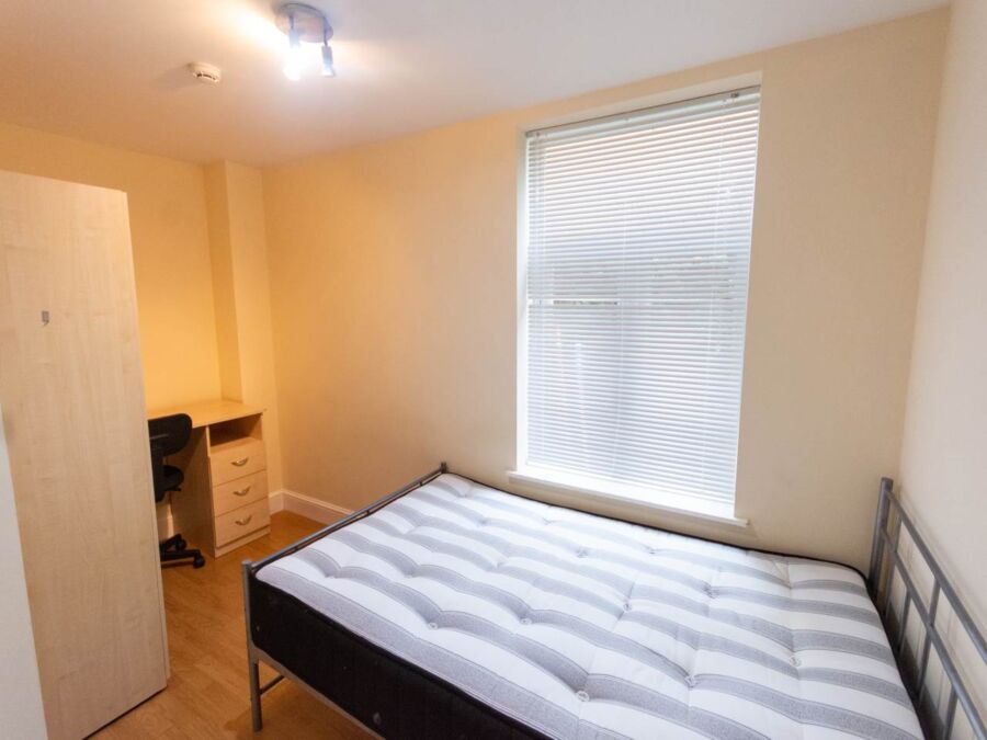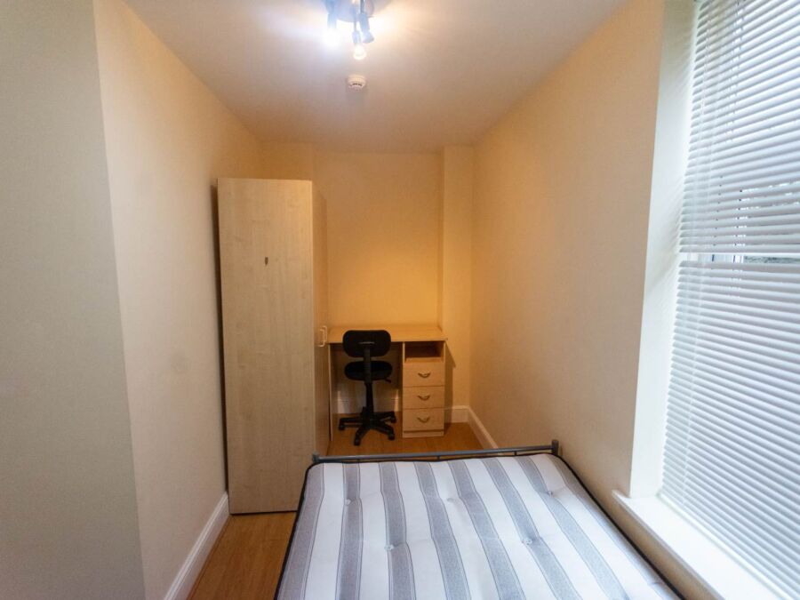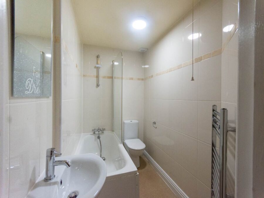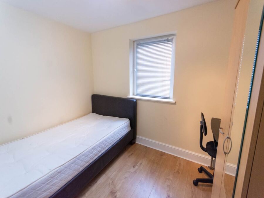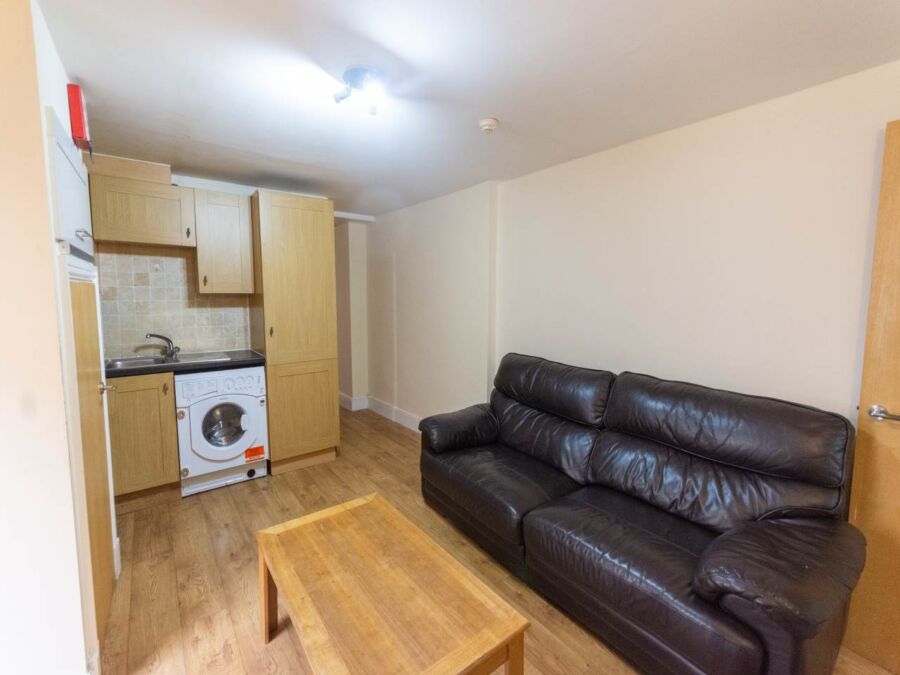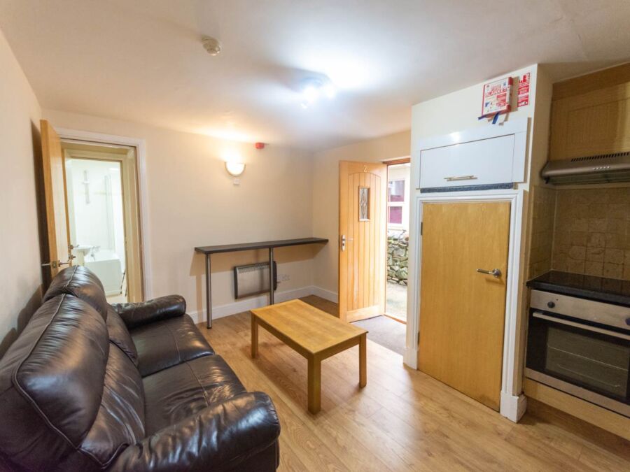 **Available From 06/07/2026* 3-Bedroom Flat: This recently refurbished ground-floor flat features dark laminate flooring throughout. It includes an open-plan kitchen with dark wood cabinetry, halogen spotlights, and chrome fittings. The spacious lounge is furnished with leather sofas. There are three double bedrooms, each with leather beds, and a fully tiled bathroom that includes a fitted shower.