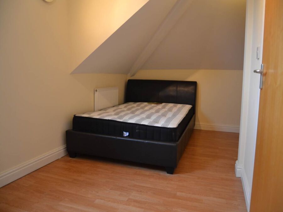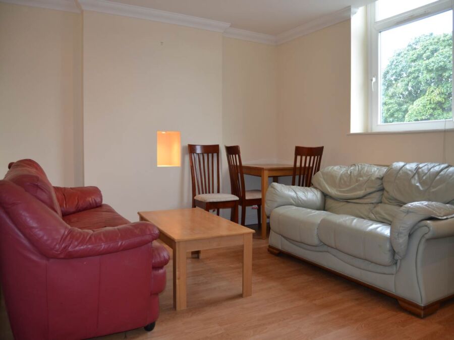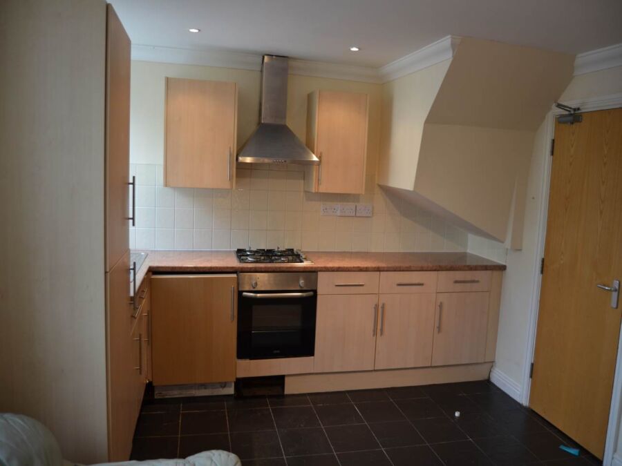 The flat features modern laminate flooring throughout and a sleek leather sofa in the living area, creating a stylish yet practical space to relax or study. The fully fitted kitchen is equipped with high-quality appliances and ample storage, perfect for preparing meals with friends or housemates. The bathroom is finished with elegant tiling, offering a clean and modern aesthetic.